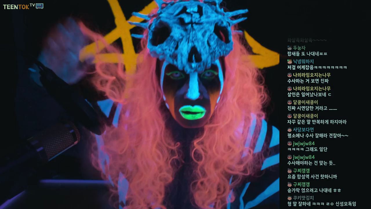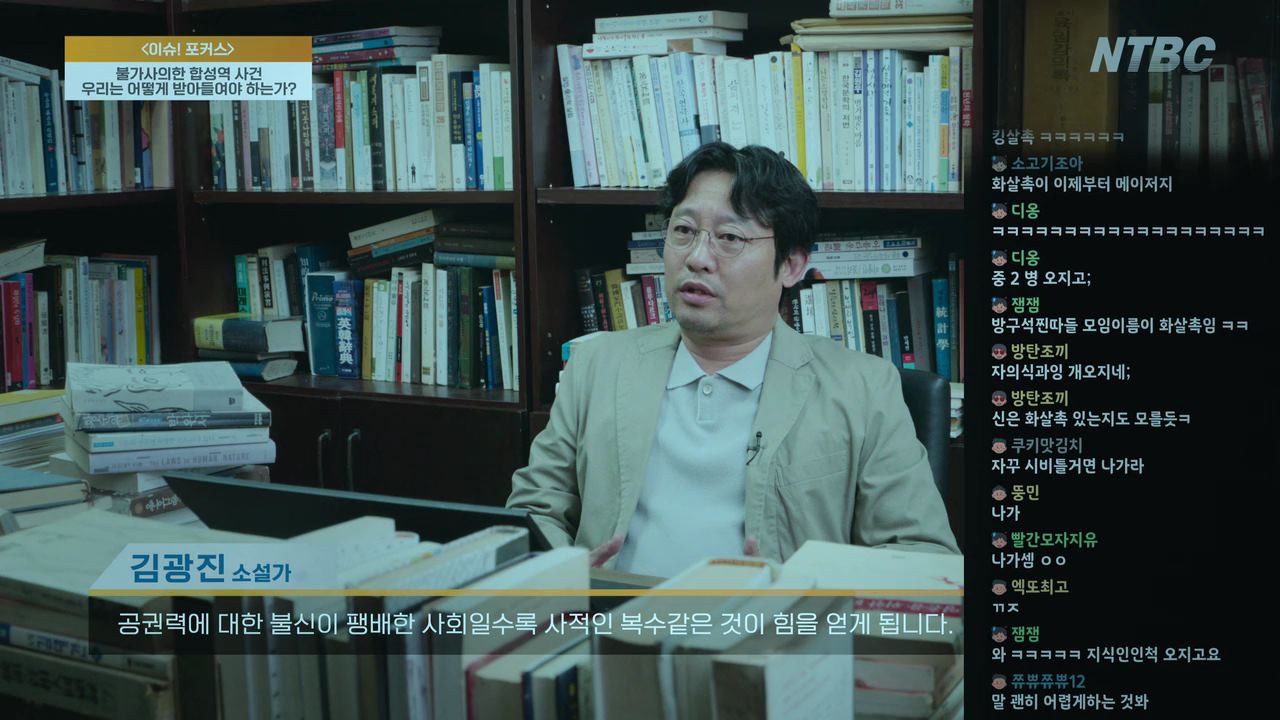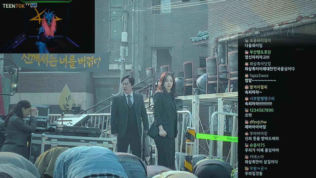한편, 새진리회를 광기가 든 사람들처럼 맹목적으로 믿는..화살촉이라는 이름의 조직이 있는데요. 스트리머라는 아이디로 개인방송을 하면서 사람들을 선동하는 화살촉맹신자가 (소 해골을 머리에 뒤집어쓰고..형광색으로 얼굴을 칠한~ ㅎ) 오늘 대낮, 차도에서 일어난 시연에 대해 실시간으로 방송을 합니다. 화면 한쪽에 화살촉 멤버들이 실시간으로 채팅을 하고 있고.. 화면 다른 쪽 한 켠에는 어디서 구했는지..오늘 시연을 당한 남자의 사진을 올려두고..스트리머는 침을 튀기며 악을 쓰고 있죠. 경찰이 해야 할 일은 신이 일으킨 사건을 조사하는 것이 아니라 오늘 시연을 당한 주영훈이란 사람이 과거 무슨 잘못을 했는지 파악해야 한다는 것이죠. 그리고 서울 한복판에서 시연이 일어난 이유는 화살촉이 있기 때문이라 주장해요. 그리고. 김광진이라는 소설가가 TV 프로그램에 출연해 화살촉의 행동을 비판했던 영상을 잠깐 틀어 주더니.. 이 소설가 이거 미친거 아니냐고 소리를 꽥꽥 질러대면서.. 그 소설가를 납치한 뒤 마구 구타하고 강제로 사과시키는 영상을 회원들한테 틀어주죠.