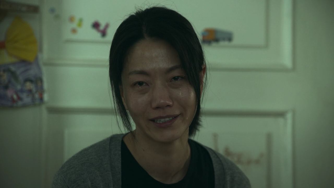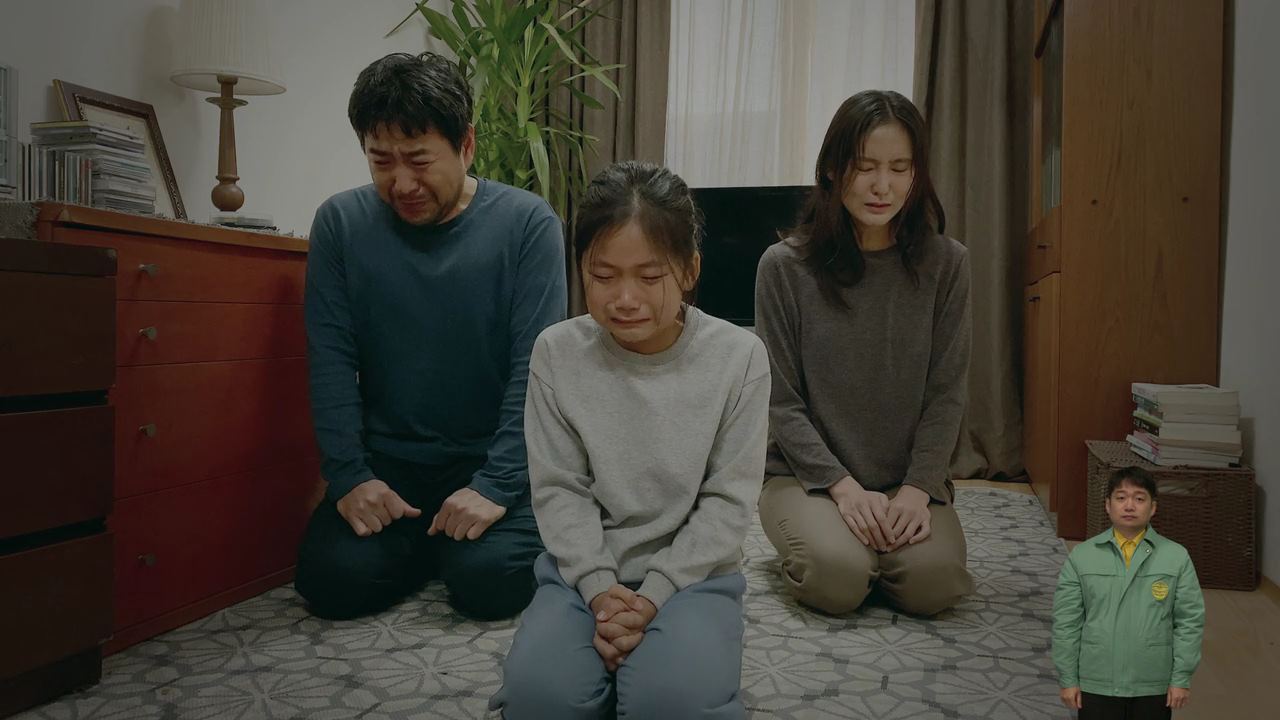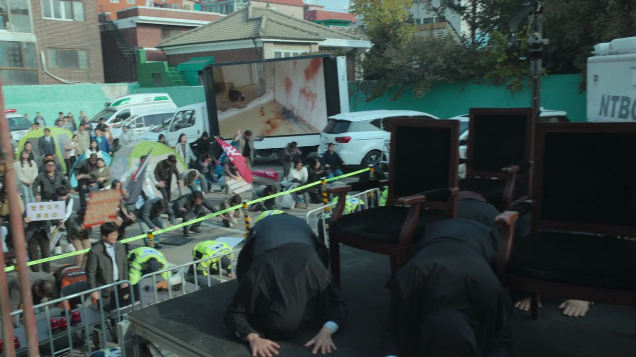 그 때. 방문이 벌컥 열리고.. 아들이 나와서 자기 엄마가 뭘 그렇게 잘못을 해서 지옥에 가냐고 정진수한테 버럭 큰소리를 치고 여동생은 울고 있자..박정자는 애들을 데리고 방으로 들어가지요. 아들을 대차게 혼내는 소리에 거실에 앉아있는 사람들도, 주방 식탁에 앉아있는 형사들도..불편한 표정을 짓고.. 몇 분이 지나..박정자는 방문을 열고 나와.. 문앞에서 무릎을 꿇고 앉아요. 그리고 정진수를 향해 ..자기 죄는..아무거나 붙여주고..우리 애들만 고생 안 하고 잘 살 수 있게 해달라며 울먹입니다. 그리고 변호사들 쪽을 향해..애들한테 아무 것도 못해주고 살았는데..어쩌면 이건 행운이고 기회라며..시연 이후에 우리 애들이 아무도 모르는 곳으로 가서 잘 살 수 있게 도와달라고 하지요.