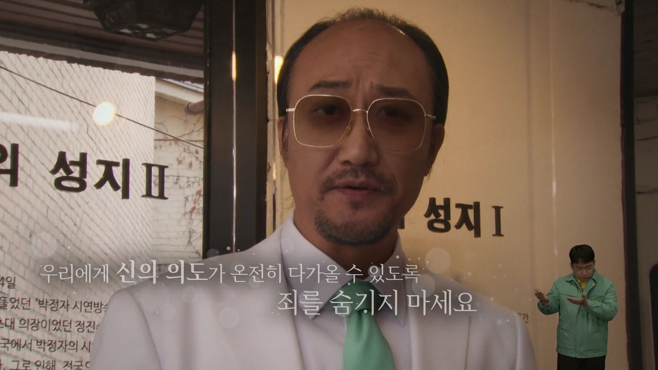 ‘김영석’이라는 죄인을 찾으러 모텔을 급습한 새진리회 사제들. 폐인이 된 김영석의 시연 날짜와 시간이 바로 오늘이라는 것을 알게 되고. 유지사제는 모텔방에 널브러져 있는 전단지에서 소도 컴퓨터 세탁이라는 명함을 발견해요. 시연 시간에 맞춰 본부 시연장으로 끌려온 김영석은 가족들과, 생중계로 전 국민들이 보는 앞에서 시연을 받게 되는데 실시간 시청률 89.3% 라는 것에 흡족한 김정칠 의장은 시연장에 올라..김영석을 바라보고 소리칩니다.