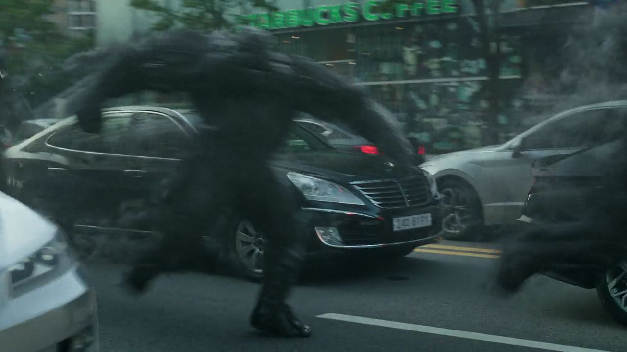 그때 카페 한 테이블에 앉아있던 한 남자가 식은땀을 뻘뻘 흘리면서 휴대폰을 붙들고 시간만 보고 있어요. 남자가 보고 있는 시간은 13시 19분.. 사람들의 수다 소리가 여전한 가운데.. 시간이..13시 20분이 되는 순간..쿵~쿵~하면서 거인이 걸어오는 소리가 들리고 지진과 흡사하게 땅이 심하게 흔들리더니..먼지를 풀풀 날리는 모양새로 검은 괴물들이 (얼굴은 바야바처럼 생겼는데..새진리회에서는 사자라고 부르죠 ㅎ)나타납니다. 카페에서 나온 남자가 괴물들을 피해 차도로 도망가구요.. 차도는 갑자기 뛰어든 남자로 순식간에 아수라장이 되는데요. 괴물들의 등장에 도로 위, 승용차, 버스 안에 있는 사람들이 다 기겁을 하고...도망간 남자를 잡으러 쫓아온 검은괴물들이 남자를 잡고 이러저리 패대기를 치는 등 구타를 하더니 손에서 강한 빛을 뿜어 이미 죽은 듯한 남자를 태워버려요. 그리고는 달려가더니 공중 속으로 사라져버립니다.