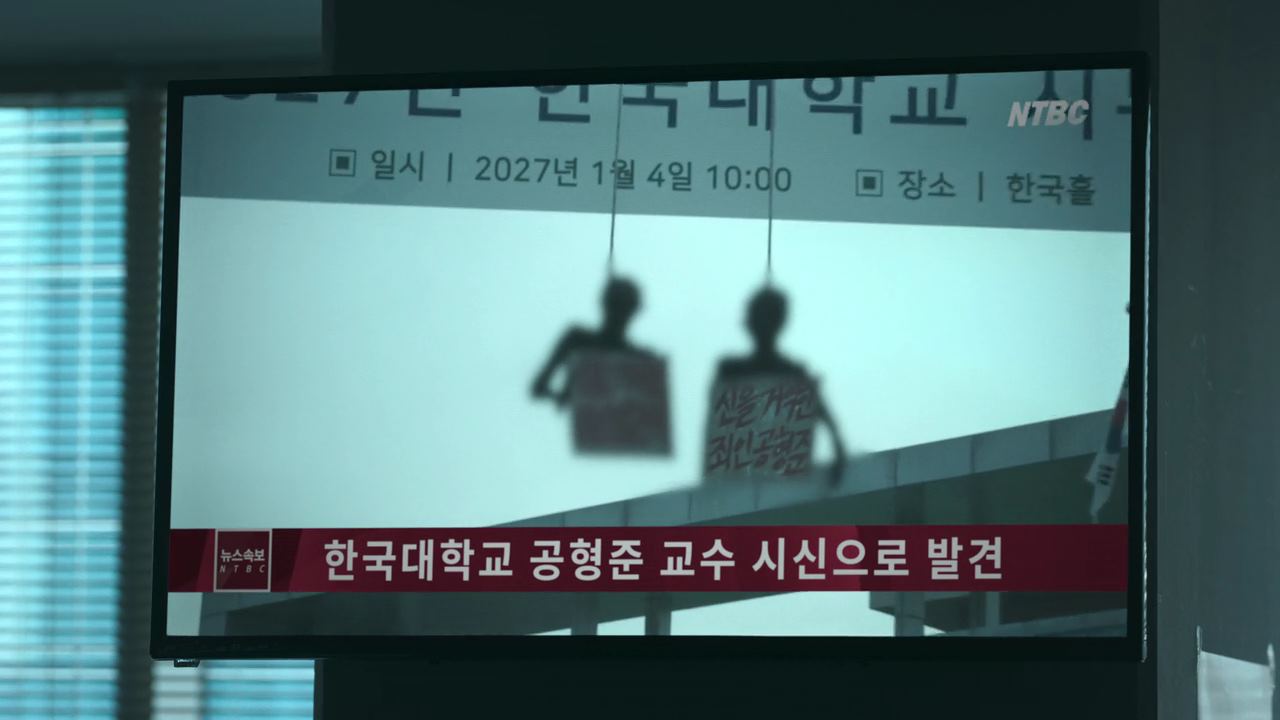 다음 날 아침, 한국대학교 입구. 경비아저씨가..걸어가다가 한국대학교 시무식이라고 써진 프랑카드 아래 걸려있는 것을 보고 기겁을 하고 도망가는데..신을 거역한 김근배, 신을 거역한 공형준이라는 푯말을 목에 달고 있는 김근배와 공형준의 불에 탄 상반신이죠. 아침 막히는 출근길 차도. 차 안에 있는 배영재가..괴로운 표정으로 운전대를 잡고 있고.. 같은 시간 배영재집. 송소희는 멍하니 앉아 있다가..천천히 일어나 옆에 새근거리며 자고 있는 아기를 내려다보고 있죠.