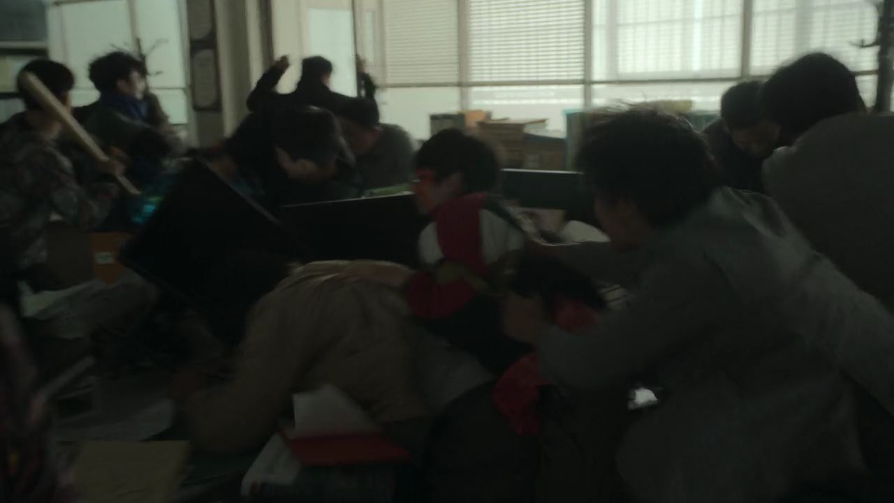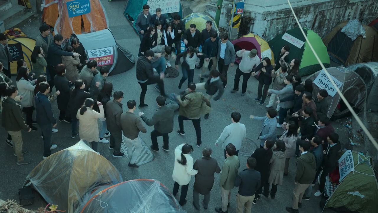 희정이한테 다시 전화를 걸어보니 여전히 안받고. 진양시 경찰서에 전화를 걸어..김창식 살인사건..무슨 증거 좀 나왔냐고 묻자..주변 CCTV 하나를 확보했다는 말을 듣고 보내달라고 부탁하죠. 전화를 끊고 한숨을 쉬는데.. 그 때..소설가 ‘김광진’을 납치해서 구타했다는 명목으로 화살촉 멤버 몇 명을 구속한 것에 대해 분개를 한 화살촉 조직원들이 각목을 갖고 경찰서로 쳐들어 와 때려 부수기 시작. 진경훈도 머리를 다쳐가며..진압하는데..책상 위로 머리가 짓눌린 화살촉 조직원 입에서 나온 소리..“신은 수사 대상이 아니다, 식구들을 석방하라~!!”