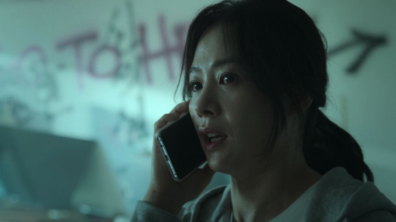 한편 화면이 바뀌고.. 주부로 보이는 박정자라는 여성이 하루 일과를 마치고 현관문을 열고 들어가는데.. 갑자기 불이 꺼지고.. 딸이 케이크를 들고 아들이 바로 뒤에서 핸드폰으로 영상을 찍으며..생일축하 노래를 부르면서 다가옵니다. 아이들로부터 감동을 받은 박정자가 .. 케이크 위 촛불을 끄고..아들과 딸을 향해 웃는 순간.. 박정자의 등 뒤 허공에서 뭔가 꿈틀꿈틀하는 것이 모습을 드러내고.. 그렇게 천사로 부터 박정자, 당신은 5일 뒤 15시에 지옥에 간다는 내용을 고지받게 되죠. 이는 아들이 들고 있었던 휴대폰에 영상으로 촬영되고.. 다음날 박정자는 민혜진 변호사(김현주)를 찾아갑니다. 박정자는 아들이 촬영한 고지 영상을 보며 주며 새진리회를 먼저 찾아 갔으나 새진리회에서는 박정자가 지옥에 가는 모습을 생방송으로 중계하고 싶다고 제안했다고 말해주며 지옥 1화가 끝나요.