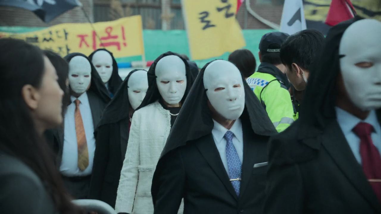 박정자 지옥 시연 당일. 시연을 보겠다고 몰려든 많은 사람들..“박정자는 신의 뜻대로 자신의 죄를 고하라~”고 피켓을 들고 시위하는 사람들로 시끌시끌하고..박정자 집 건물과..맞은편 건물은.. 시연을 받고, 구경하기에 딱 좋게 개조해졌지요..많은 방송국에서도 생중계 준비를 하고 있고, 30억 자금의 출처라고 생각되는..VIP 라고 탈을 쓴 사람들이 맨 앞줄 의자에 와서 앉지요. 천사가 고지한 시간이 불과 몇 분 앞으로 다가오고.. 박정자는 중간에 놓인 의자에 앉아 눈물을 뚝뚝 흘리며 두려움에 떨고 있고. 사람들은 침도 안 삼키며 박정자를 뚫어지게 보고 있는데..마침내 천사가 고지한 15시가 되고 굉음이 울려 퍼지면서 2화가 끝나요.