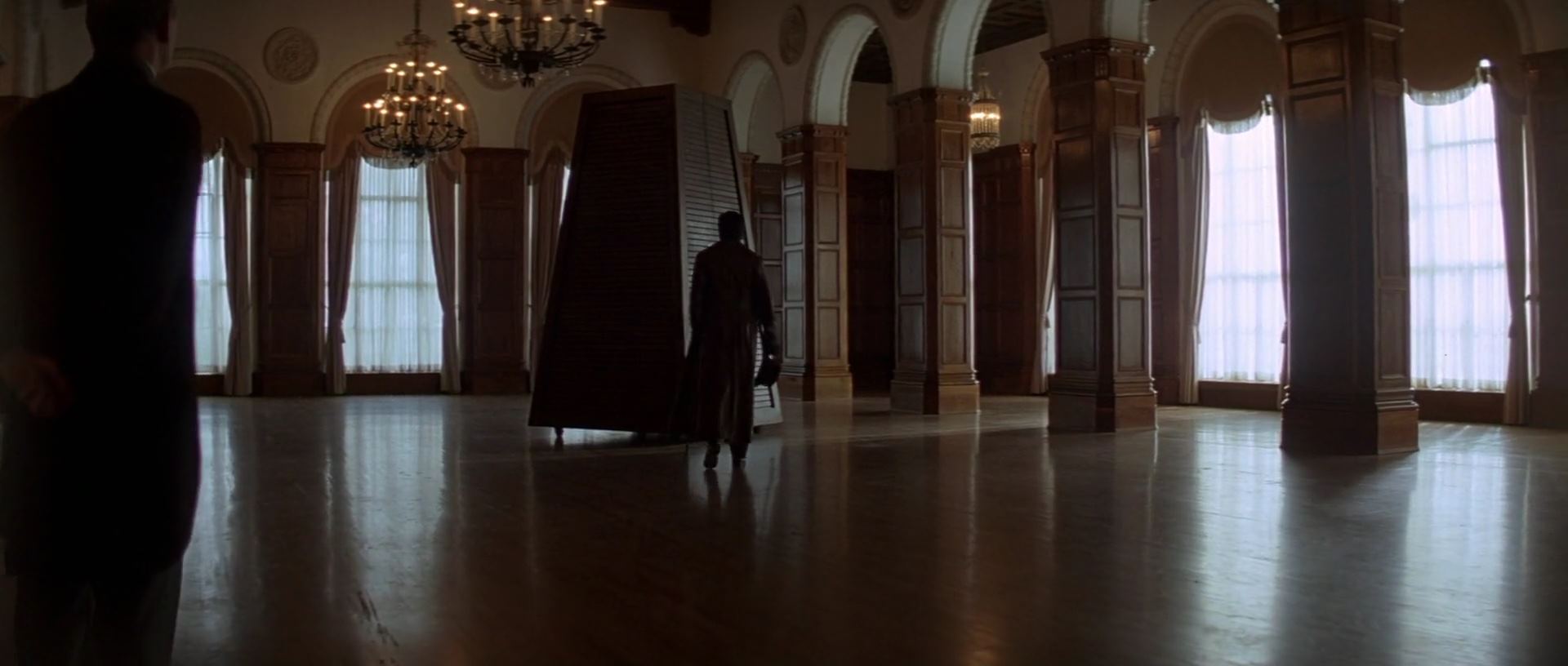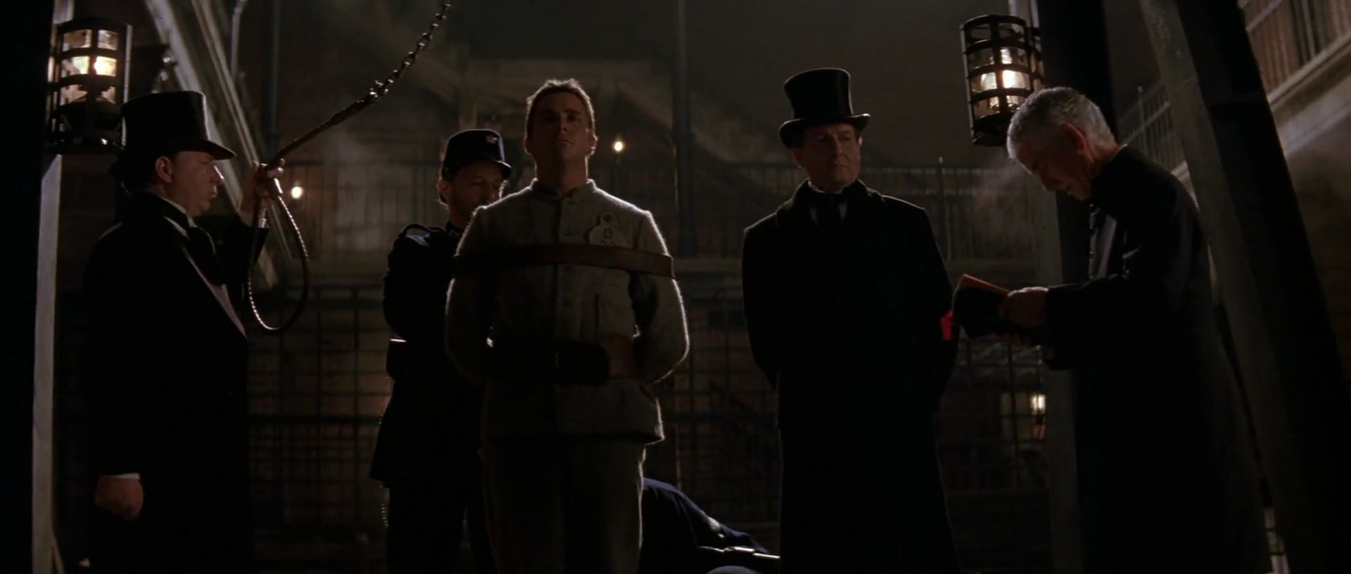 한편, 원래 신분인 '콜드로 경' 으로 살아가기 위해 마술사의 삶을 정리하고 있던 앤지어와 그를 돕는 커터. 예전 커터가 앤지어의 와이프가 죽었을 때 앤지어를 위로해준다고 어떤 익사 할 뻔한 선원이야기를 해 준 적이 있어요. 그 선원이 고향처럼 편안함을 느꼈다 하더라면서요....근데 다시 그걸 언급하면서 커터가 말하죠. 그거 거짓말이었다고.. 그 선원은 엄청 고통스러웠다 했었다고요.. 착잡하고 씁쓸한 표정의 앤지어를 두고..커터는 냉정하게 가버립니다. 혼자 멍하니 있다가 다시 물건을 정리하는데...뭔가가 자기쪽으로 굴러오는 게 보이고 잡아 들어 올리니..빨간 마술 공~!! 보든이 사형대에 올라가 손과 발이 묶이고 몸이 줄에 걸리는 순간, 앤지어가 누군가한테 총을 한 방 맞습니다. 뚜벅뚜벅 걸어오는 사람은 바로...보든!!