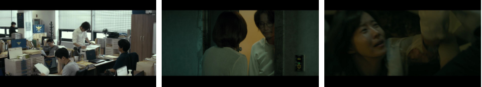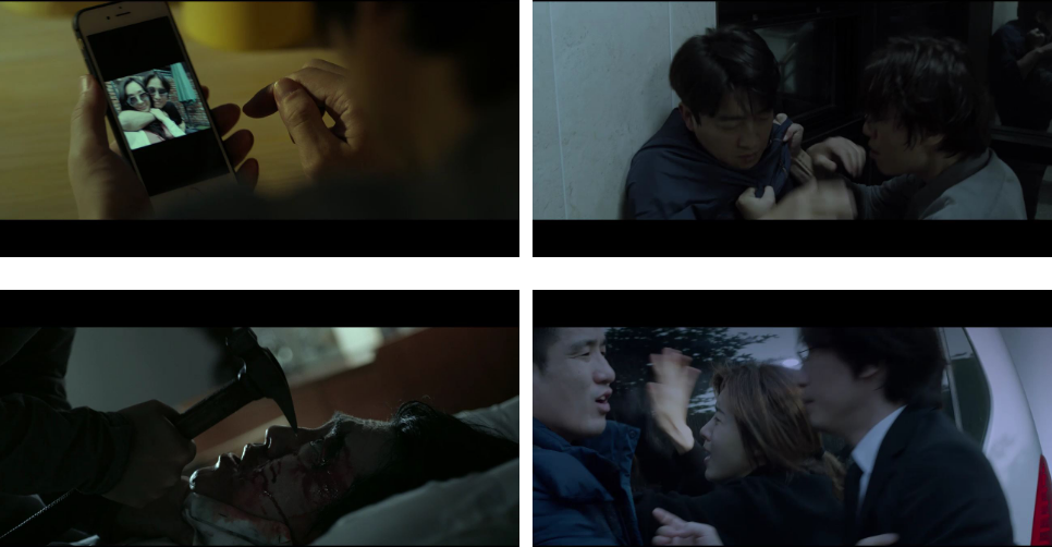 어느 건물 1층.. 폴리스라인이 쳐져 있고.. 사람들이 웅성거리는 소리로 소란스러운 분위기로 영화는 시작합니다. 그 건물쪽으로.. 집에서나 입는 편안한 차림에 위에 점퍼만 입은 남자가(오민석) 헐레벌떡 뛰어와 폴리스라인을 무시하고 급하게 건물 계단을 올라 가서.. 집안을 들어가 보니.. 여기저기 사진을 찍고 있는 과학수사요원들과 형사들이 집안 여기저기를 조사하고 있습니다. 가쁜 숨을 쉬며 좁은 보폭의 걸음걸이로 천천히 들어가는 남자 눈에.. 문이 열린 침실이 보이는데요.. 침대에 남자도 아는 듯한 여자가 피를 흘리고 죽어있어요. 놀라서 우뚝 서버린 남자를 한 형사가 보고는 여기 함부로 들어오면 안된다고 밖으로 내보내려고 하고.. 남자가 '영훈' 이는 어딨냐며 강하게 반항하자.. 형사 두 명이 더 붙어서 남자를 집밖으로 끌어냅니다. 질질 끌려나가는 남자가 바닥의 떨어진 피를 보고.. 위층으로 향하는 계단 위에도 계속 떨어져 있는 핏자국을 눈으로 따라가니.. 계단 끝에 영훈(송새벽) 이 넋이 나간 듯 앉아 있고 옷 여기저기에 피가 묻어있죠. 계단에 앉아 있는.. 영훈(송새벽) 이라는 남자는 침대에 죽어있는 여자의 남편이구요. 그런 영훈에게 다가가 울면서 영훈을 끌어안은 남자는 준성(오민석)이라는 이름의.. 영훈의 친구에요. 카메라가 줌아웃 되면서... 건물 전체가 잡히고.. 짐승의 포효에 가까운 울음소리가 조용한 밤의 정적을 깹니다..
