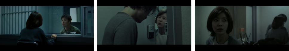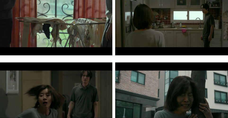 재연 과정을 보여주기 위해.. 화면이 바뀌고 때는 다시 과거. 영훈이 집안을 다 청소한 후 현관문 앞에 있던 수상한 남자를 제압하고 들어와서 상처의 피를 빨래 건조대 위 수건으로 닦고 난 뒤 이상함을 느꼈을 때로 돌아가고.. 영훈은 경찰서 형사한테 받아 온 유정의 유품 속 사진들을 바탕으로 사건이 있었던 그 때 그대로의 현장으로 다시 재연합니다. 이사를 가고자 어딘가로 보낸 가구들을 취소하고 돌려받아 그 때와 똑같이 배치해 놓고, 집앞에 버려뒀던 쓰레기를 다시 찾아와서 최대한 있던 그대로 놓고..침대 시트를 가져간 청소업체에 전화해서 다시 돌려 받아 가지고 와서는 빨간 페인트를 그 위에 다시 붓고 현장 사진에 찍혔던 대로 문과 바닥에 핏자국을 빨간 페인트로 다시 그려 놓죠. 그리고는 칼을 들고서는 괴성을 지르며 마치 누구랑 싸우고 있는 것처럼 휘둘러 보기도 하고.. 바닥에 누워 누군가한테 목졸림을 당하고 있는 것처럼 자기 목을 조르며 바둥거려봅니다. 그리고는 마지막으로 빨간 페인트 물이든 침대시트 위에서 아내 유정처럼.. 누워서 천장을 응시하고 있어요.