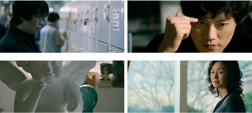 거뭇한 색의 날카로운 무언가가 박혀있는 듯 하구요. 한숙희 교수가 생각을 하는데.. 딸 아이가 갑자기 공격을 당하고 석고상이 몇 개 바닥에 놓여져 있는 곳으로 천천히 이동을 하구요.. 그곳으로 따라 온 정철진이 살해도구인 헤라로 마구 찔러대는데.. 장혜진이 옆에 있던 석고상으로 막고..순간 정철진은 석고상에 헤라를 찔러버리죠. 정철진 역시 약과 술에 취해 정신이 온전치 못한 상태구요.. 무죄를 선고 받고 밖으로 나와 정철진이 지연한테 했던 말.. 신나게 찌르고 있는데 갑자기 헤라가 사라져버렸다는 말은.. 사실이었죠~!! 암튼.. 한숙희 교수도 그 장면을 상상하더니 석고상을 높게 들고 바닥으로 던져버리죠. 박살이 난 석고상 조각들 사이로.. 피가 묻은..검고 날카로운 헤라가 보이구요. 그걸 주워들은 한숙희 교수가 ..죽어가는 딸아이의 고통이 느껴지는지 꺼억 꺼억~오열을 하는데.. 그러다가 갑자기 눈에 힘을 준 한숙희 교수가.. 결의에 찬 표정을 지으면서 ..영화는 완전히 끝나요. ㅎ