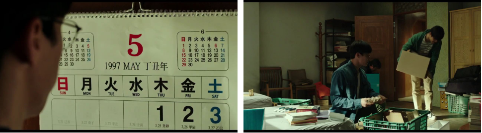 새 집 안에 들어가서 진석의 가족들은 각자 다 짐을 풀고 자기 짐들을 정리하기 시작하고, 유석은(형, 김무열) 집 벽에다 1997년 달력을 걸어놔요. 이삿짐 직원들과 진석과 유석은 바삐 움직이면서 서로 힘을 합쳐가며 짐들을 옮기고 있는데..유석(형)이 진석(동생)에게 말하기를.. 진석이가 쓸 방은 2층이고 당분간은 불편해도 자기와 같이 방을 써야 한다면서 .. 전 집 주인이 짐을 아직 다 빼지 못해서 2층 구석의 방에 짐을 몰아놨고 또 그 방은 절대 열어 보지 말라고 전 집주인이 아빠에게 신신당부했다는 말도 하죠. 진석은 좀 이상해 하면서도 알았다고 하면서 짐들을 마저 정리하기 시작해요. ㅎ