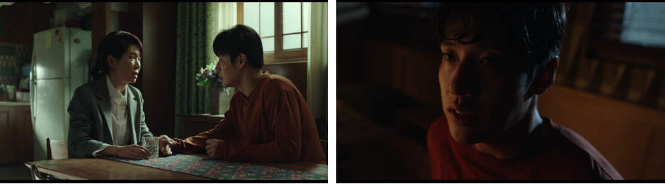 문고리를 천천히 돌려 문을 연 어머니가 침대 위를 뚫어져라 쳐다보며 다가오더니 이불을 확 걷어내고 쫄딱 젖어있는 진석을 보죠. 어머니가 방밖을 나갈 때까지 눈을 감고 있다가 나가는 것 같은 문소리에 진석은 눈을 뜨고 일어나 헉헉거리며 숨을 몰아쉬고, 그 순간! "이제 일어났냐~?" 고 말하는 어머니의 목소리가 들려오고 진석은 깜짝 놀라 고개를 돌리는데, 알고 보니 어머니는 바로 밖으로 나간 게 아니라 나가는 척 방문을 열었다가 닫힌 후 방안 안보이는 곳에 계속 서 있었던 것이죠. 어머니는 진석에게 약올리는 듯한 말투로 방에만 있었던 너가 어디 다녀오기라도 한 것처럼..땀을 왜 이렇게 엄청 흘렸냐는, 의미심장한 말을 하며 방에서 나갑니다. 형도 형이 아니고 어머니도 이상하다는 생각이 든 진석. 어쩌면 아버지까지도 가짜가 아닐까 생각하면서 모든 게 잘못되어 있다는 것을 깨달은 진석은 창문을 통해 집에서 탈출을 하지만 떨어지면서 낸 비명소리를 집안에 있는 어머니가 듣고 있죠. 그렇게 집을 나와 두리번거리면서 도망가려고 하는데 집 앞에서 아버지와 마주치게 되고, 진석의 뒤에는 언젠가 시장가에서 봤던 형 유석의 부하가 서있습니다. 아버지가 진석을 보고 어디 가냐고 묻자, 진석은 당황해서 떨리는 목소리로 친구 좀 만나러 간다고 대답해요.