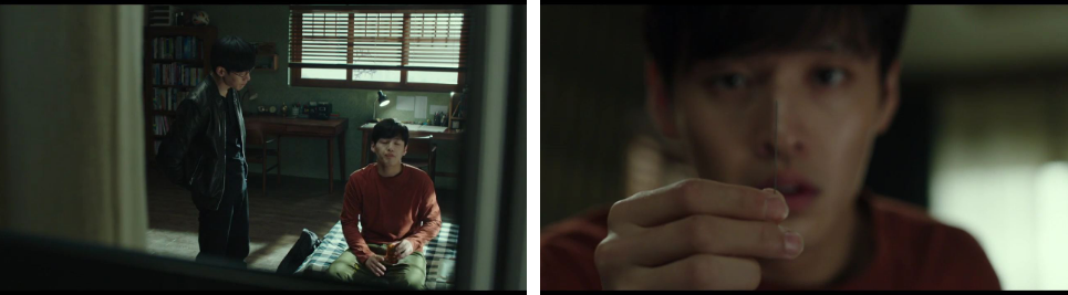 진석이 책 위의 샤프연필 속 길게 빠진 샤프심을 보면서, 어젯밤에 유석이 진석의 샤프를 들고 진석의 눈을 향해 샤프를 찌르려고 했던 일과 유석이 다리를 안 절고 담배 피우던 것, 경찰이라고 속인 두 남자와의 추격전 그리고 진석이 택시를 타고 유석을 몰래 뒤쫓아갔던 어젯밤의 모든 일들이 꿈이 아닌 진짜 100프로 사실임을 알게 된거죠. 동시에 그 순간! 진석은 자신은 형에게 택시를 탔다는 말을 한 적이 없었다는 사실을 깨닫게 됩니다. 같은 시간..집을 나와 다리를 절면서 어디론가 가던 유석은 누군가의 전화 한 통을 받고 "내가 지금 가니까 기다려."라는 말을 하고 전화를 끊고나서는, 다리를 절지 않고 정상적인 걸음으로 걸어갑니다.