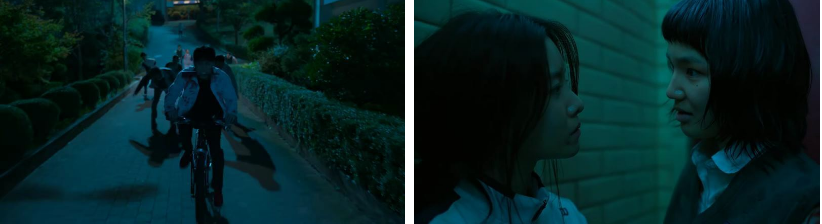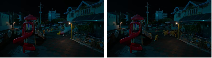 유튜버는 카메라를 통해서 이곳을 지옥이라고 묘사하며 계속 방송을 하고 있고 조용하고 어두운 길을 걷다가 불이꺼진 유치원 건물로 들어갑니다. 유치원 건물 입구에 서서 아무도 없는 어두운 복도를 카메라로 담고 있는데.. 인기척 소리에 달려오는 어린 좀비들... ㅠ 마당으로 뛰어가 미끄럼틀로 도망가는데 유튜버를 어린 좀비들은 떼를 쓰는 모양새로 끝까지 쫓아가요. 어린 좀비들의 얼굴은 클로즈업 되어 보여지지 않네요... ㅎ