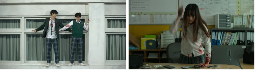 핸드폰을 찾기 위해 교무실로 가기로 한 청산과 수혁. 청산은..수혁한테 온조가 고백했다는데 어떡할거냐 살짝 묻고 청산의 마음을 어느정도 안 수혁은 사귈까 말까 놀리죠 ㅎ 옥상에서 계단을 통해 내려온 은지는 달라붙은 좀비한테 물어 뜯기면서도 핸드폰을 깨부셔버리겠다는 일념으로 좀비들이 달라붙은 몸을 질질끌면서 힘겹게 교무실로 향하는데 좀비들이 하나 둘씩 떨어져 나갑니다. 어떤 좀비가 은지의 얼굴에 코를 바짝 대고 냄새를 맡아 보더니 고개를 돌리자 은지는 이상하다 하면서도 급하게 교무실로 뛰어 들어갑니다. 어렵게 교무실 창틀에 발을 딛은 수혁과 청산은 최대한 소리나지 않게 천천히 바닥으로 착지한 후..소리 안나게 포복자세로 한참을 기어가는데.. 눈에 핏발이 선 은지가 핸드폰을 하나씩 바닥에 치면서 깨부수고 있는데 몸이 한 번씩 우두둑 꺾이죠. 아이들이 제출한 모든 핸드폰이 은지 손에 의해 깨부셔지고 있는데.. 핸드폰 한 개가 수혁과 청산 앞으로 떨어집니다. 은지와 손을 뻗어 주우려는 청산의 눈이 마주치고 괴성을 지르며 달려드는 은지를 수혁이 밀어내고 다른 좀비들이 돌진하자.. 수혁은 창틀로 다시 올라서고 청산은 먼저 방송실로 돌아가 있으라는 말을 남기고 복도쪽으로 뛰어갑니다.