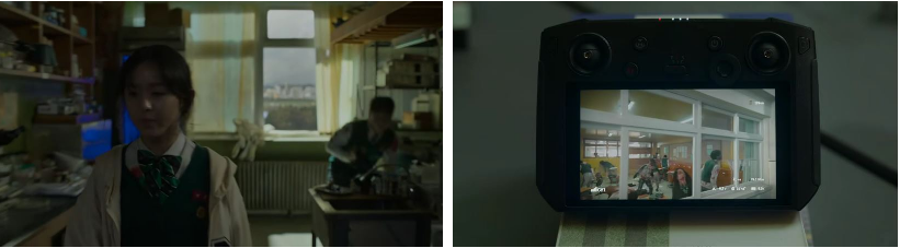 온조와 준영이 2층 방송실을 내려오고 드론에다가 효산고등학교 방송실에 학생들이 갇혀 있다는 문구를 써 붙이고서는 준영이 드론 스마트 안경을 착용하고서는 리모컨을 들고서는 일단 학교 안의 청산이를 먼저 찾고 밖으로 나가서 구조대가 보이면 착륙시키겠다고 하고 조종을 하려고 하는데..절대 절망하지 말자는 남라와 너와 같은 논리보다 지금은 희망이 더 중요하다는 온조가 미묘한 기싸움을 잠깐 벌이죠. 일단 드론을 날리는 것이 지금 제일 중요하다는 대수 ㅋ..드론이 창문을 통해 날아가고 운동장을 비롯해서 학교 곳곳을 다니는데 사방이 다 좀비인 상황을 조그만한 모니터를 통해 보는 아이들이 눈쌀을 찌푸리면서 탄식을 합니다.