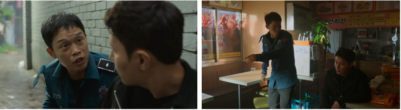 좀비들로 폐허가 돼 버린 효산시 어느 거리. 형사 재익과 후배는 길 모퉁에 숨어 있구요. 문이 열린 차 한 대를 가리키는 재익이 키가 꽂혀 있을 것 같냐고 물어보고..주변 그르렁 거리는 좀비를 본 후배 형사는 ..어디 안전한 곳에서 그냥 구조를 기다리는 것이 낫지 않겠냐고 하지만..과학선생 노트북에 해결 방법이 있다는데 빨리 재난 본부 가서 알려줘야 할거 아니냐며 재익은 답답해 합니다. 잔말 말고 따라오라고 찜해 둔 승용차 쪽으로 재익이 뛰어가죠 ㅎ 울상을 지으며 재익을 향해 후배는 뛰어가고 좌우에서 달려드는 좀비를 피해 재익이 운전석에 앉아있는 승용차 조수석에 타는데 성공하지만 차는 시동이 걸리지 않고 다음 화면에 미친듯이 질주하는 재익과 후배 뒤에는 근처 좀비들이 다 따라서 달리고 있고 ㅎ 일단 몸을 숨기고 보자고 들어간 식당은 희수와 희수 아기가 있는 청산네 식당이죠.