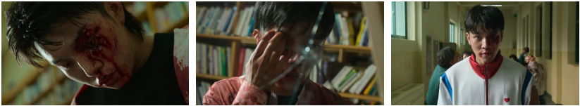 방송실 창문으로 수혁이 혼자 들어오고..추격전을 벌이던 청산과 귀남은 한참을 뛰어가다가 도서관으로 들어가 책장들 사이를 술래잡기 하듯 뛰어다녀요. 한 책장에서 만난 둘이 서로의 옷자락을 붙들고 그 좁은 공간에서 몸싸움을 하고 있고 좀비들은 그런 둘이 싸우고 있는 책장을 흔들어 대고 있죠. ㅠ ...청산위로 올라탄 귀남이 우세인 상황.. 청산 주머니를 뒤져 핸드폰을 꺼내자 청산이 다시 빼앗고. 자신의 목을 조르는 귀남의 왼쪽 눈을 핸드폰 모서리로 찍어버립니다. 괴로워 비명을 지르는 귀남을 청산이 책장 아래 좀비무리들 쪽으로 밀어버리자 귀남은 좀비들한테 물어 뜯기면서 너 기필코 죽여버린다는 말을 계속 반복하고 하구요...ㅠ