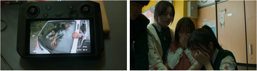전기줄으로 목을 메 죽어있는 학생을 지나..음악실로 들어가는 드론.. 한 쪽을 응시하고 있는 청산의 모습에 아이들이 환호하며 목청껏 청산이를 불러보지만 준영이가 여기서는 당연히 안들린다고 하죠. ㅎ ..민지가..청산이 찾았고 배터리 부족하니 밖으로 내 보내자고 해요. 드론이 천천히 운동장을 가로지르자 소리를 내면서 움직이는 드론을 향해 모여들면서 손을 휙휙 내젓는 좀비들이 보이고 학교 정문 입구에 양궁부팀 셔틀 버스가 보이더니.. 얼마 안가 흰 용달차 문쪽에 검은 승용차가 심하게 박혀 있는 모습을 보고 민지가 잠깐만!! 하고 소리를 지르며 벌벌 떨더니 급기야 눈물까지 흘립니다. 준영이가 두 대의 차쪽으로 드론을 조종하자 흰 용달차 안에서 드론을 향해 반응을 보이고 있는 중년의 남녀 좀비들이 보이고... 민지는 우리 부모님들이라며 오열을 합니다. 방송실 안 분위기가 숙연해지고 온조는 민지를 안아주죠.. ㅠ 리모컨을 조종하는 준영의 손가락 힘도 빠지면서 드론 역시 방향을 잃고 공중에서 추락.. 구조요청 종이는 바람에 날아가버립니다. ㅠ