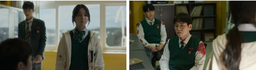 청산은 좀비들을 의자로 쳐내고 밖으로 나가..잽싸게 복도 벽 배관함을 열고 들어가고.. 한 좀비한테 발목이 잡히지만 하리의 화살에 맞고 그 좀비가 쓰러져요. 화살과 대걸레 막대로 복도 좀비들을 해치운 양궁부팀. 네 동생 찾다 우리가 죽겠다는 미진과 후배 민재 마저 나가자고 하니 하리는 심란해지는데요. 한편, 학교 건물 옥상에서 은지가 내려가고 혼자 옥상에 남아 있는 철수는.. 희미하게 ..은지가 핸드폰을 깨부스는 텅텅거리는 소리를 들으면서 괴롭게 흐느끼고 있습니다. 배관함을 통해 위쪽으로 올라간 청산은 긴급전화 112를 눌러보는데 신호가 안잡히고..양궁부팀인 민재와 하리, 준성과 미진은 보건실 문을 열고 들어가는데..보건샘 책상 위 컴퓨터를 보고 SNS 통해서 살려달라고 구조요청을 하자고 입을 모으고요.