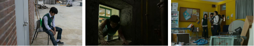 양궁부팀 하리와 민재 그리고 미진과 준성이 있는 보건실. 3학년인 미진은 한숨을 쉬면서 얼마 안있으면 있을 수능걱정을 합니다. 갑자릭 하리가 양궁부 훈련장에 비상전화기가 있는데 수화기를 들기만 하면 119와 연결된다고 하면서 어차피 화살도 거기에 다 있으니 훈련장으로 가자고 하죠. 어느쪽으로 가자고 작전을 짜는 애들을 향해..그냥 안전하게 여기 있으면서 어른들의 구조를 기다리면 안되냐고 준상은 울상이죠. 자신은 어른들 안믿는다는 하리가 민재 먼저 복도로 나가서 달려오는 좀비들을 쏘고 쓰레기장 쪽으로 뛰어내려가고 미진, 준성은 민재를 도와 뒤를 따르면 자신이 달려드는 좀비들 다 막아내고 제일 마지막으로 뛰어내리겠다고 합니다. 그런 식으로 네 명이 보건실을 빠져나간 순간 드론이 보건실로 향하고 난장판인 보건실과..좀비한테 꽂힌 화살을 보고 우진은 누나 하리는 오늘 시합나갔을거라고 중얼거립니다.