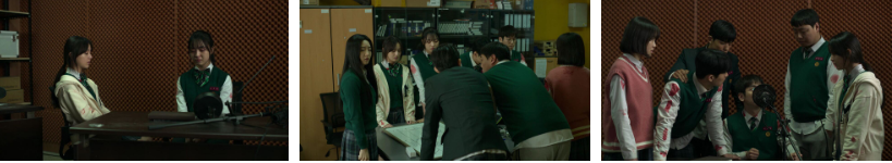 방송실 부스안. 지민을 온조가 옆에서 위로해요. 지민이 답답하다면서 여기서 나가고 싶다며 스피커 쪽으로 엎드리자 스피커 스위치가 켜지면서 나는 삐~ 소리에 부스밖 아이들이 귀를 막는데.. 잠시 후.. 1학년 때 엄마의 성화로 방송부였던 남라가 부스안으로 들어가서 스피커를 잠시 만지작 거리더니.. 아이들한테 어쩌면 나갈 수 있을 것 같다는 말을 합니다. 건물 한 쪽 스피커만 켜서 그 쪽으로 좀비들을 보낸 후 청산을 찾아 중앙 계단쪽을 통해 옥상으로 올라가자는 남라는 설명 한 후 방송실 벽에 붙어있는 오래된 CD 한 장을 플레이어에 넣고 스피커를 켜자 시끄러운 삐~ 소리에 일반 좀비들은 반응을 보이고 음악실에 있는 청산이도 소리가 들리는 음악실 스피커를 바라보지만.. 유독 좀비 중에서도 진화가 됐다는 귀남과 은지만 귀를 틀어막고 괴로워 합니다. 수혁은 스피커를 통해 청산이한테 그 쪽으로 갈테니 움직이지 말고 기다리라고 말하고..비품실 안에서 나연이도 방송을 듣고 있고..복도에 있는 귀남역시 의미심장한 미소를 띄면서 듣고 있어요.