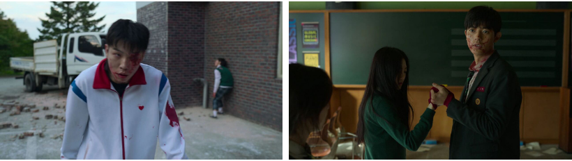 방송실에서 나갈 준비를 마치고 남라가 아까 CD를 틀어보는데.. '명상의 시간' 음악이 흘러나오구요. ㅎ 남라가 건물 왼쪽부분에 있는 스피커 볼륨들만 싹다 올리자 좀비들이 그 쪽 스피커로 달려갑니다. 복도가 조용해지고..최대한 벽에 붙어 한 줄로 가자고 결론을 내린 아이들이 무슨일을 대비해서 수혁이 맨 뒤에 위치한 채..허리를 숙이고 한 줄로 천천히 가고 있는데 우진의 텀블러가 텅~하고 떨어지자..아이들과 좀비는 동작을 멈추는데..수혁이 뛰어!! 라고 소리치면서.. 우르르 달려가는 아이들이 계단으로 올라가고 쫓아온 좀비와 수혁이 뒤엉켜 싸워요. 텅 빈 방송실로 들어간 귀남이 아이들이 음악실로 갔다는 것을 알고 다시 살기를 띈 표정으로 나가..좀비가 수혁을 물려는 순간 귀남이 도와주고..귀남이 좀비가 된 줄 모르는 수혁은 도와줘서 고맙다면서 귀남의 다친 눈을 보고는 괜찮냐고 물은 후.. 손에 든 식칼을 봅니다. 청산을 찾는 귀남을 보고 그만 좀 하라는 청산.. 귀남은 옛날부터 이래라저래라 지랄이냐며 갑자기 식칼을 휘두르고 수혁과 살벌한 격투를 벌여요. 수혁을 눕히고 목을 조르는 귀남뒤로 달려간 남라가 귀남의 목을 헤드락을 걸자 귀남은 남라의 왼쪽 팔뚝을 물어버리죠.놀란 수혁이 귀남의 뒤통수를 가격하고 휘청거리고 있는 귀남을 열린 창문으로 던져버리죠. 바닥으로 추락한 귀남은 다시 피를 토하면서 죽은 듯 정신을 잃어요.