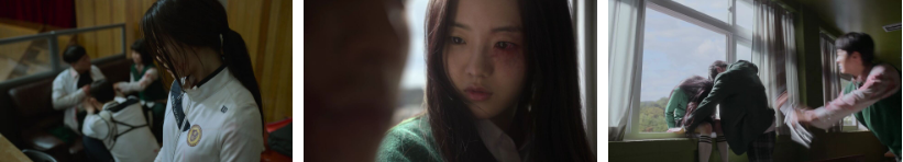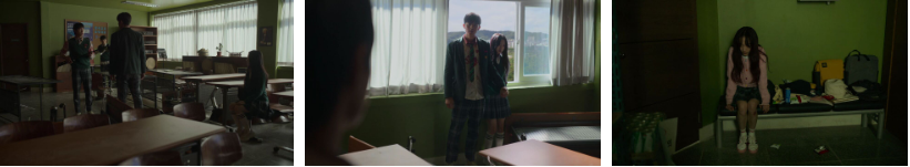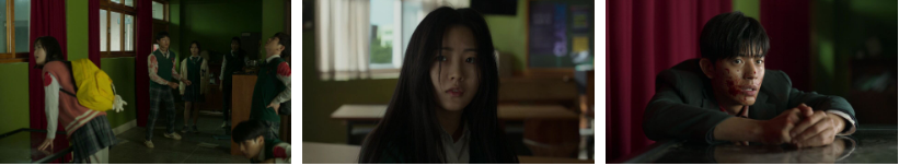음악실. 귀남은 좀비가 아니었다고 다시 한 번 주장하는 수혁..그럼에도 경계를 늦추지 않는 청산의 모습이 불편한 남라는 일어서서 문쪽을 향해 걸어가자.. 급하게 수혁이 반장을 부르면서 남라의 팔목을 잡아요. 돌아서서 수혁을 본 남라가.. 늘 반장이라고만 부르지..자기 이름 한 번 부르는거 못 들어봤다며 뿌리치려고 하자.. 수혁이 남라의 손을 잡고 창문으로 가더니 커튼을 제끼고 창문을 열어 둘이 잡은 손을 보여주면서.. 반장 좀비로 변하면 너희들한테 못가게 창밖으로 밀어버릴테니까 걱정말라고 해요. 누그러뜨리는 다른 친구들관 다르게 악보 거치대를 든 청산이 좀 더 수혁과 남라 곁으로 다가가구요.. 오지말라고 경고했다는 수혁과 다 필요없다며 요지부동인 청산. 그리고 비품 관리실에서 아이들 말을 듣고 있는 나연이 용기를 내서 문고리에 손을 올리자..딱 경수까지이고.. 더 이상 친구 안 잃겠다는 청산 말에 나연의 손에서 힘이 빠집니다. 무기같이 생긴 거치대가 자신과 남라를 겨누고 있는 청산이 몹시 불편한 수혁이 욕설을 날리며 주먹으로 청산을 치려고 하자.. 남라가 제발 그만하라고 소리치고.. 자기가 좀비가 되면 알아서 죽을테니 걱정 말라고 하면서 수혁이한테 변하면 자기 확 밀어라면서 창틀에 걸터 앉죠.