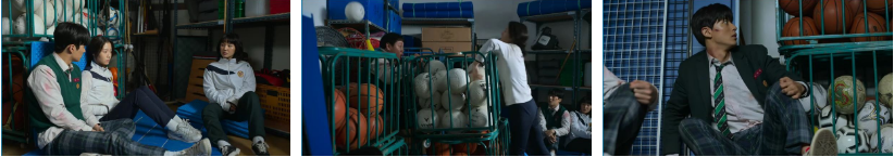 농구부 연습실.. 지친 아이들이 좁은 비품실 안에서 벽에 기대거나 친구들 어깨에 기대 눈을 붙이고 자고 있고..한쪽 벽에 청산과 온조는 나란히 앉아있죠. 앞으로 자기 어떡하냐고 울먹이는 청산의 손을 잡아주는 온조가..조금만 더 있다가 얘기하자고 해요. 여기를 나가서 밥도 먹고 목욕탕도 갔다와서 얘기하자면서..너와 나 할 얘기 많지 않냐고 청산의 등을 토닥거리죠. 위로가 청산..무슨 일이 있어도 포기하지말라는 온조말에 알았다고 해요.