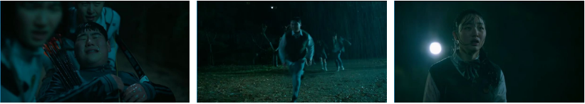 좀비들을 피해서 방향 생각 못하고 마냥 뛰느라 아이들이 들어간 건물은 학교 농구부 연습실이었죠. ..민지와 양궁부 민재만 뺀 나머지 애들이 전기가 나가 깜깜한 농구부 연습실 안으로 들어가는데.. 표정이 일그러지는 남라는 애들한테 도망가라고 소리치고.. 순간 번개가 쳐 연습실이 환해지자.. 연습실 곳곳에서 그르렁거리고 있는 좀비들이 보입니다. 비명을 지르고 다시 뛰는 아이들.. 비품실을 향해 뛰어가는데요.. 손에 뭐라도 들고 있는 아이들과 활을 들고 있는 하리는 좀비들을 상대하면서 뛰어가고..이들의 엄호를 받으며 미진은 준성이 탄 카트를 힘겹게 혼자 끌면서 가고 있지만 준성은 미진이 위험해지자 준성은 자신을 묶은 끈을 풀고 옆으로 굴러버리죠. 준성은 삽시간에 좀비들한테 둘러싸이고 비명을 지르며 준성한테 뛰어가려는 미진을 하리가 붙들고있죠. 그렇게 가까스로 비품실 안으로 들어간 아이들. 얼마간의 정적이 흐르고..대수가 청산한테 다가와..아까 너네 엄마인 줄 몰랐다고 미안했다고 사과를 해요. 청산이 흐느끼자 온조가 옆에서 안아줘요.