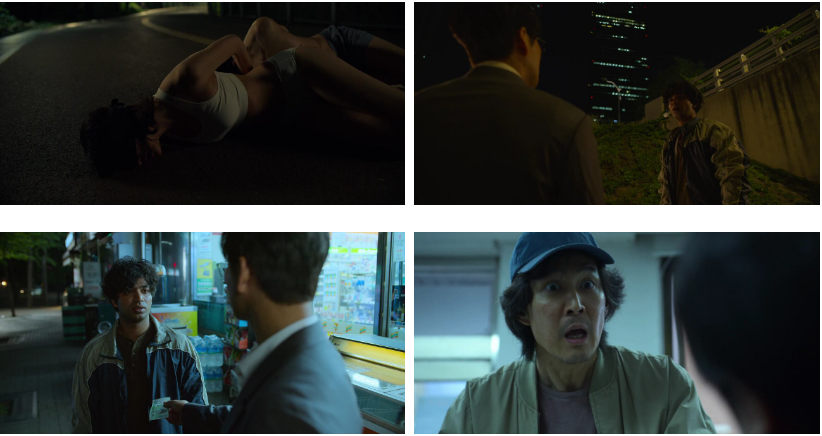 기훈은 엄마 병원비 때문에 친구한테 돈을 빌려보지만..실패하고...편의점에서 술을 마시고 있는데 일남할아버지를 그 자리에서 우연히 만나게 됩니다. 같이 술을 기울이며 이얘기 저얘기를 하는데..어차피 죽을목숨이니..자기는 다시 오징어게임을 하러 가야겠다고 일남할아버지는 말하죠...기훈은..그런 선택은 안하리라 생각하며 전부인 집까지 찾아가서 200만원인가 빌려달라고 사정을 합니다. 그러는 도중 전부인 새남편이 애들(기훈딸과 전부인이 재혼해서 낳은 아들)과 함께 들어오고.. 기훈은 안되겠다 싶어 나가게 되고 아파트에서 나와 걸어가는데.. 전부인 새남편이..따라나와 봉투를 주면서..필요하신 돈이니 받으시고 앞으로 우리들 앞에 나타나지 말아 달라는 말을 합니다. 자존심이 박살이 난 기훈은 표정이 일그러지면서.. 봉투를 남자한테 던지고 주먹으로 한 대 쳐버리는데..그걸 딸 가영이 쳐다보고 있고..