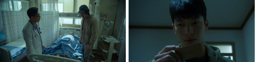 그 때 준호라는 경찰이 서에 들어와서 기훈이 주고간 명함을 유심히 쳐다봅니다. 준호라는 캐릭터도 주요인물인데요. 준호라는 인물은 경찰이고 형이.. 어느날 갑자기 실종이 된 형이 있습니다. 기훈의 황당한 말에 다른 경찰들과는 달리 준호가 관심을 갖는 이유는 바로 형이 실종됐기 때문이기도 했고.. 형이 생활했던 고시원에서 기훈이 경찰들한테 주고간 명함 비슷한 것을 봤기 때문이죠. 기훈은 기운이 하나도 없는 상태로 집으로 가지만..전화 한 통을 받고 달려간 병원에는 기훈모가 누워있고..당뇨가 심하게 안 좋으셔서 지금 상태가 너무 안좋다는 말을 의사로부터 듣게됩니다. ㅠ 준호는 확인차 다시 형 고시원으로 달려가고.. 완전 똑같은 명함을 발견하죠.