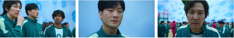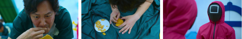 가장 복잡하게 생긴 '우산'을 선택해서 땀을 뻘뻘흘리며 떨리는 손으로 바늘에 침만 열나게 묻히고 있는데..땀이 한 방울 달고나에 떨어지자 녹는 것을 보고 테두리 부분은 상대적으로 얇아 뒷면부터 녹이면 자연스레 모양이 떨어져 나올 것이라고 생각하고 뒷면을 핥기 시작합니다. 그걸 보고 주변 사람들이 다 기훈을 따라하고 .. 뭐하는 것인지도 모르는 듯 마냥 좋아라하는 일남할아버지도 기훈을 따라하면서.. 별모양을 분리하고. 불과 3초남겨두고 기훈도 성공을 합니다. 한미녀는 담배랑 같이 가지고 있는 라이터로 바늘을 달궈 쉽게 성공하고..나가면서..깡패 덕수한테 라이터를 던져줍니다.