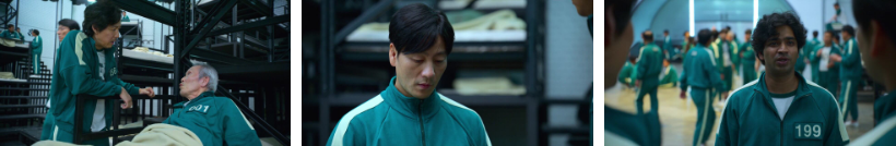기훈과 다른 참가자들을 태운 스타렉스는 배에 올라타고.. 형사 준호도 잠입에 성공. 수면마취된 참가자들을 확인하러 나온 참가요원을 때려 눕혀 죽이고 자기가 그 복장을 하죠(요원들 중 서열 맨 아래인 동그라미). 그렇게 옷을 빼앗아 입고 같은 요원들 속에 섞여있는데. 이들한테는 상급자가 말을 걸기전까지는 말을 걸어선 안된다는 규칙이 있는데..이를 모르는 준호는 먼저 말을 거는 실수를 하지만..처음에는 큰 일 없이 그냥 넘어가죠.