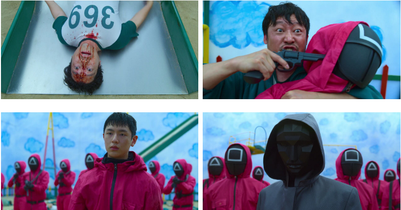 게임이 진행되는 과정에서 모양이 부러져버린 참가자들은 감시하는 요원들에 의해 바로 총살ㅠ. 시간초과로 죽게 생긴 한 참가자가 요원의 총을 뺐고 네모요원을 볼모삼아 위협을 하는데요. 요원 등을 겨누며 복면을 벗고 얼굴을 공개하라 해요. 하는 수 없이 요원이 복면을 벗고 돌아서니..20살은 넘었을까 싶은..젊디젊은 남자아이..ㅠ 협박하던 참가자는 말이안되는 이 상황에 너무 충격을 받고 스스로를 쏴 생을 마감해요. ㅠ 소란스러워진 게임장에.. 프런트맨이 나타나 절대 가면을 벗어선 안된다는 규칙을 어긴 네모요원을 총으로 쏴 죽여버립니다. 쓰러진 네모요원의 복면을 준호가 주워들면서 3화 끄읕~ ^^