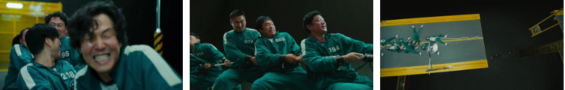 상우는 그렇게 앞으로 세발자국만 동시에 가자고 소리를 치고..안그래도 끌려가고 있는데 뭔소리냐. 얼른 떨어져 죽잔소리냐..내분이 생기는 듯하는데. 이래죽나 저래죽나 속는셈치고 해보자고 결론에 이르고..상우 말대로 동시에 빠르게 세발자국을 가니 갑자기 상대팀이 뒤로 자빠지면서 기훈팀은 그 반동으로 다시 뒤로 죽어라고 잡아당기는데.. 상대는 뒤로 넘어졌다가 제대로 일어서지도 못하고..점점 끌려오다가 밑으로 추락..그렇게 줄다리기 단체전이 끝나고..줄다리기에서 탈락된 사람들의 몫이었던 20억 정도되는 돈이 돼지저금통에 쌓입니다.