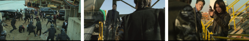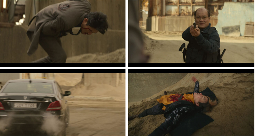 기호의 체포하라는 명령이 떨어지자.. 동천파와 강재파 그리고 경찰들이 섞여 싸우면서 아수라장이 되고요. ㅎ 무진과 강재를 뒤에서 기호가 쫓습니다. 그리고 도착한 지우. 강재와 무진을 보고 뛰어가고 그 모습을 필도가 보죠. 지우가 강재를 향해 총을 겨누는데.. 무진과 엉겨붙어 싸우는 바람에 좀처럼 초점이 안맞고. 더 가까이 가는데.. 지친 강재의 칼이 떨어지고..무진이 우세인 상황에서 강재를 밀치는데...멋있게 살고 싶었다며 깔깔웃어대는 강재한테.. 어리석은 선택을 한거라는 무진. 신발속 단도를 꺼내든 강재가 너도 마찬가지라며 달려들어 찔어대는.. 무진..칼을 떨어뜨리고..다리에 힘이 풀려 주저앉으면.. 혼자 안 죽는다는 강재가 웃어 제끼는데.. 그 때.. 총성이 울리고.. 보면 지우가 강재를 향해 총을 겨누고 있죠..