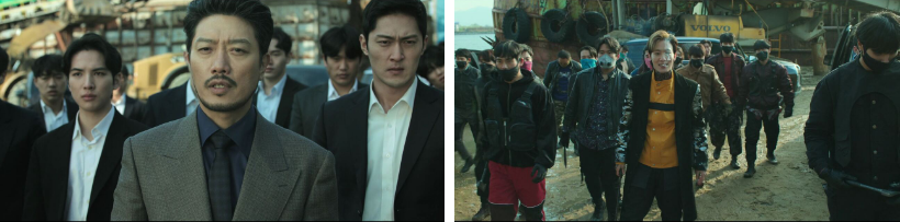 초조한 표정으로 담배를 피우며 기호한테 계속 전화를 하는 강재 옆으로..자동차 엔진소리가 들리고.. 무진을 필두로.. 깔끔한 정장차림의 동천파 조직원들이 그 뒤로 자리를 한 후.. 무진이 강재이름을 크게 부르며 나와서 인사하라고 하니.. 강재와 그 조직원들도 차에 나와 맞짱 뜰 기세로 서서.. 못 보고 가면 어떡하나 했는데 마침 잘 왔다고 해요. 저마다 기합소리를 내고 시작되는 두 파의 싸움. 보고 있는 필도가 진입하냐고 기호한테 묻고. 마침 일대일로 붙게된 무진과 강재.. 입만 나불거리는 강재 무진 손에 쉽게 나가떨어지고.. 근처에 떨진 칼을 쥐어 냅따 도망을 가자.. 무진이 그 뒤를 쫓죠.