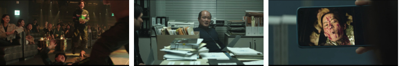 그리고 시작되는 무진과의 격투..칼을 들었음에도 몇 명을 해치우고 온 지우는.. 맨손인 무진한테 몇 번이나 나가떨어지고.. 지칠대로 지친 지우를 무진은 뒷주머니에서 칼을 빼 찌르려고 하지만 역공격을 당합니다.. 잠깐 주저앉은 무진이..아까 지우가 내려놓은 총을 집어 들고 일어나서는.. 넌 여기까지라고 절대 괴물은 될 수 없을거라 도발하자. 갑자기 바들바들 떨더니 눈에 힘을 주고 소리를 지르며 칼을 들고 무진을 향해 돌진하고..달려오는 지우를 보고 얼른 방아쇠를 당겨보지만.. 달칵거리는 소리만 몇 차례 들리죠.. 벽쪽으로 떠밀려 아랫 목이 찔린 무진.. 놀람과 고통스러움을 최대한 절제하는 듯한 표정이고.. 칼을 두차례 더 깊게 박는 지우는.. 무진의 죽어가는 모습을 똑똑히 보려는 듯..살기에 번들거리는 눈으로 무진의 왼쪽 눈과 오른쪽 눈을 번갈아 쳐다보고 있죠. 무진은 그렇게 지우 손에 무참히 죽임을 당해요.