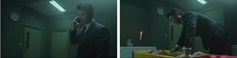 혼자 멍하게 앉아있는 무진한테 강수연 변호사가 전화를 해서 동료형사가 데리고 사라져버렸다는 사실을 전합니다. 무표정인 상태로 품안에 넣는 무진. 자세를 낮춰 관 안에 정장으로 말끔하게 차려입은 태주의 시신을 물끄러미 바라보더니 넥타이를 옳게 매만져 준후..태주의 시신위로 극락왕생이라는 한자가 쓰인 도포를 덮고 관뚜껑을 닫죠.