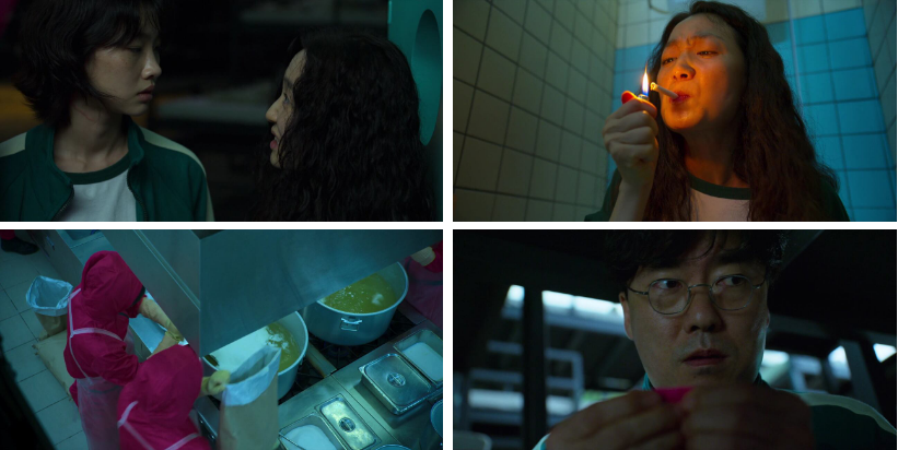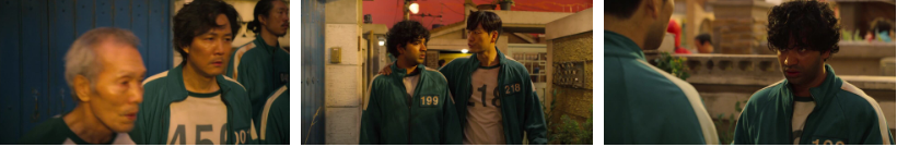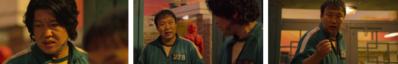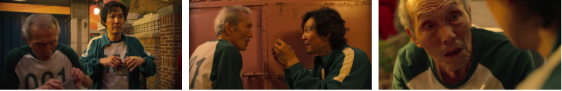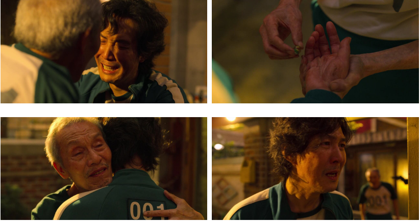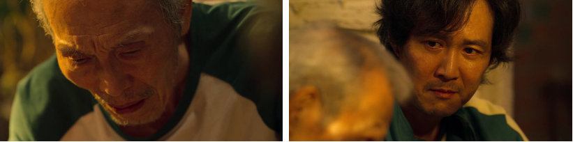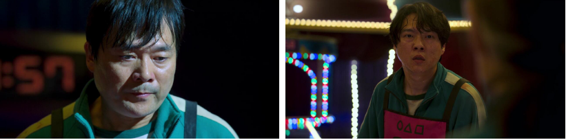 어디까지가 진실이고 어디까지가 거짓이냐고 오일남이라는 이름은 당신 진짜 이름이냐 묻는 기훈한테 이름도 사실이고 머릿속에 종양이 있는 것도 사실이고 옛날에 아들과 아내와 그런 골목집에서 산적도 있었다고 하죠. 그 때 창밖 노숙자한테 누군가 상태를 보려고 다가가는데 이내 그냥 가던 길 가버립니다. 일남은.. 기훈한테 물어요..아직도 사람을 믿나? 그 일을 겪고도..? 그러면서.. 자네가 456억은 쓰지도 않고 지내고 있다고 들었다고 죄책감 같은거냐고? 그 돈은 자네의 운과 노력의 대가니 자네는 그걸 쓸 권리가 있다고 자기를 좀 보라고 삶은... 짧다고 하죠.