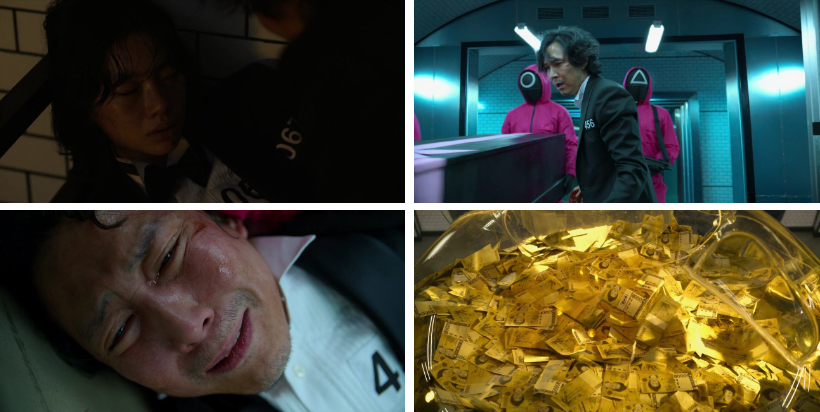 자정되기 5분 전. 기훈은 알아야겠다며 왜 그런 짓을 한거냐 재차 묻고.. 일남은 말하죠.. 자네..돈이 너무 없는 사람과 너무 많은 사람의 공통점이 뭔 줄 아나?? 그건 바로...사는게 재미가 없다는 거야~돈이 너무 많아도 사고 싶은 것 사고, 먹고 싶은 것 먹고, 하고 싶은 것 하고 나면 시시해져 버리는 거야.. 언제부터인가 내 고객들이(게임 방청했던 VIP들) 나한테 그러는 거야 살면서 더 이상 즐거운 게 없다고.. 그래서 모여서 고민을 좀 해봤지.. 뭘 하면 재미가 있을까하고..라고..