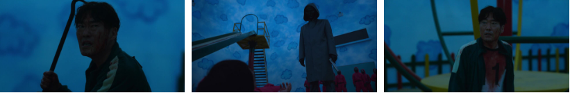 대망의 마지막 게임의 날. 그건 바로 오징어 게임...첫번째 게임을 했던 운동장으로 비장한 모습으로 나오는 두사람. 선공격-기훈, 선수비-상우로 결정이 되고. 프론트맨은 VIP들한테 그 옛날 한국 아이들이 많이 하고 놀았던 놀이라고 소개를 하죠. 아이들이 하는 가장 육체적이고 폭력적인 게임이라고 설명을 덧붙여요. 오징어 모양의 선 안에 들어선 기훈, 상우...새벽을 상우가 죽였고 그런 상우에 대한 분노가 여전한 기훈은 ....운동화 끈을 질끈 묶으면서 흙도 한줌 쥐고 일어나죠. 프론트맨이 VIP들한테 게임 룰을 열심히 설명하고 있지만..가까이 다가온 상우 얼굴에 기훈이 쥐고 있던 흙을 던져버리면서 엎치락 뒤치락...게임 룰과는 영~상관없는 육탄전. ㅎ;;