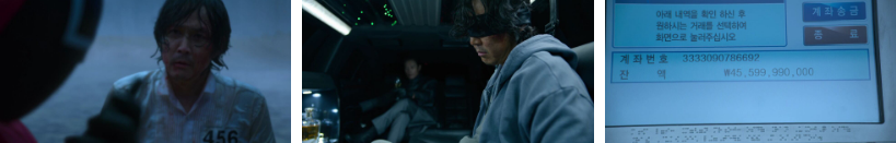 456억의 주인공이 된 것을 축하 한다는 방송을 듣고 있는 기훈.. 눈 감고 있으면 죽었는지 살았는지 모를 정도의 몰골. VIP들도 가면만 두고 사라지죠..기훈은 눈이 가려진채 프론트맨 가면을 쓰지 않은 이병헌과 리무진을 타고 어디론가 가고 있고...이병헌은 축하합니다 아주 멋진 경기였어요, 당신들은 경기 말 같은 존재였고..한바탕 꿈을 꿨다 생각하십시오. 성기훈씨에겐 꽤 괜찮은 꿈 아닙니까? 라고 말하며 기훈을 어디 길가에 내려줍니다. 기훈입에 VIP 골드카드를 물려준 채....비틀비틀 기훈은..ATM기로 가서 만원을 출금하고 잔액을 보며...456억이 가짜가 아니란걸 확인합니다...