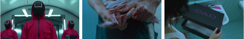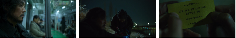 그로부터 1년 후 추운겨울.. 죄책감에 정신줄을 놔버린 듯 .. 돈이 그렇게 많으면서도 피골이 상접한 몰골이고..ㅠ 어느 날 은행장을 만나 왜 456억을 한 번도 출금을 안하냐며 이런저런 소리를 듣기도 하고, 은행장한테 만원을 빌려 그날 밤 한강에서 소주를 마시고 있는데 .. 꽃 한 송이 좀 사달라는 할머니가 다가오고.. 주머니에 든 천원을 주며 한 송이를 받아듭니다...그 안에..노란색 종이를 발견하고 열어보자...네모, 세모, 동그라미가 있고 돌려보면..언제 어디로 오라는 듯 시간과 장소가 적혀 있고 바로 아래 문구에 기훈의 눈이 커집니다..." 당신의 깐부로부터..."
