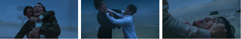 공격을 당한 상우는 괴로워하고 ..그 때 갑자기 소나기가 내리기 시작, 빗속에서 한참을 뒤엉켜 싸워요 ㅠ 허벅지와 손바닥을 찔린 기훈은..일어서려는 상우 발목을 물어 뜯고..쥐고 있던 칼로 상우 바로 옆을 내리꽃은 후..천천히 일어나 목적지를 향해 걸어가고. 요원은 상우의 머리를 향해 총을 겨누는데..갑자기 기훈은 게임 안한다고 중단을 선언합니다. VIP들도 지금 뭐하는거냐며 승리 코앞에서 저러는 심리는 대체 뭐냐는 듯 웅성웅성. 기훈은 누워있는 상우를 향해. 집에 가자고 하죠... 하지만, 상우는 나가도 지옥인건 매한가지인 현실..거절해요. 그리고 형과 나는 둘 다 돌아가기엔 너무 멀리 왔다면서..미안하다는 한마디를 하고 옆에 꽂혀있는 칼을 뽑아 자기 목을 찌릅니다...ㅠ 뛰어와 자기를 감싸 안는 기훈한테...자기 엄마 좀 부탁한다 하죠..ㅠ
