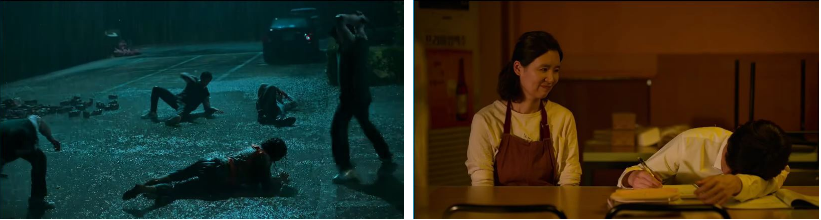 학교 뒷산으로 이어지는 입구쪽 주차장에서 용달차를 사이에 두고 청산은 엄마를 만나지만 이미 좀비가 돼버린 엄마는 청산한테 바로 달려드는데 먼저 나간 대수와 준영 그리고 우진이 청산을 구하기 위해 청산모를 들고 있는 무기로 사정 없이 내려칩니다. 그걸 본 청산은 아이들을 공격하고 청산의 엄마인걸 알지만 안되겠다 싶은 수혁은 청산의 양 어깨를 잡지만 청산이 울면서 엄마를 부르짖자 청산모를 내치치고 있던 남자애들이 공격을 멈추고 놀라 쳐다보죠. 그 사이 다른 좀비들이 뛰어오고 엄마때문에 쉽게 자리를 뜨지 못하는 청산을 데리고 뒷산으로 뛰어 올라가는데..무슨 경계에 막혀 더 이상 쫓아오지 못하는 좀비들에 섞여 함께 그르렁 거리고 있는 엄마한테서 못내 시선을 떼지 못하는 청산은.. 아이들한테 이끌려 가면서 치킨가게 안에서 엄마와 즐거운 한 때를 보냈던 때를 생각하죠.