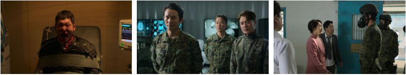 좀비가 된 이재준 하사가 격리실에서 팔 다리가 묶인 채 그르렁거리고 있습니다. 유리창을 통해 재준의 모습을 바라보고 있는 사령관한테 의무관은 열심히 설명하고 있어요. 전역을 일주일 남겨두고 자진해서 구조에 투입된 하사라면서.. 지금 계엄상황이라 부모님 불러서 동의를 받을 필요도 없다고.. 백신이든 치료제든 만들기 위해서는 질병관리청으로 옮겨야 한다고 주장하지만.. 듣고 있던 사령관은 격리지역에서 벗어나면 안된다고 하죠. 그리고.. 자식을 넘겨받은 군의 도리가 아니라면서 부모님 불러서 동의도 받으라고 해요. 국방위 소속 박은희 의원이 지금 격리지역에서 검사 대기중이라면서 효산고로 헬기 한 대만 보내달라는 말을 하더라고 의무관은 말합니다. 사령관 사무실로 자리를 이동한 의무관과 사령관.. 그리고 컴퓨터 현재 구조상황을 보니 구조된 학생들은 0명이라는 사실에 경각하죠. 놀고 있는 헬기가 한 대도 없다는 보고에 ..블랙호크(?) 라도 띄워라는 사령관.. 그리고 어머님이 계시는 강하동(?)도 둘러볼까냐고 조심스럽게 물어보는 의무관한테 사령관은 잠시 생각하다가 구조 지역으로 선정이 되면 그 때 확인을 하라고 한 후..착잡한 표정을 짓습니다.