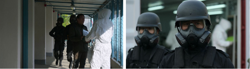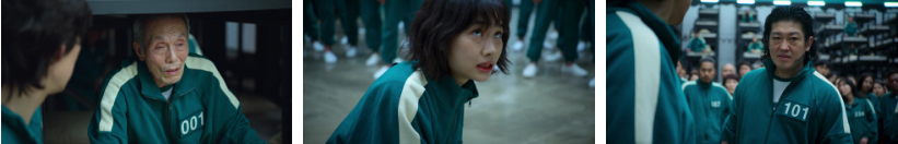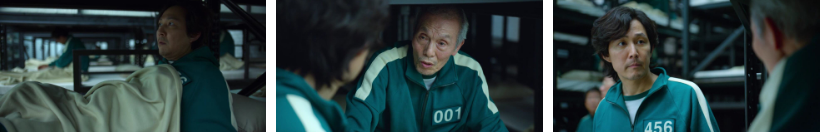경쾌한 음악소리에 깨어보니 엄청 넓은 공간에서..몇 백명의 사람들이 초록색 츄리닝차림으로 잠에서 깨어 두리번 거리고.. 그런 장면을 모니터링하고 있는 게임 진행요원들..일명 '일꾼'들... 그들 차림은 빨간색 후드 츄리닝을 입고 얼굴은 까만색 가면을 썼는데.. 가면에 동그라미, 세모, 네모가 그려져 있어요. 그리고 게임참가자들을 모니터링 하고 있는 일꾼들 뒤로 다른 옷차림과 가면을 한 남자가 뒷짐 쥐고 서있죠 (프론트맨) ㅎ 참가한 사람들이 공간 한 가운데로 모이고.. 기훈은 80대 초, 중반으로 보이는 어르신을 발견하고 몇 명왔는지 세고 있다는 어르신한테 벽 전광판을 가리키며 456명 왔다고 알려주죠. 어르신 번호는 001번, 기훈 번호는 456번. 기훈은.. 우리 둘이 처음과 끝이네요 하면서 ..며느리가 차려주는 따뜻한 밥 드시면서 편하게 지내시지 이런 데 뭐하러 오셨냐고 하는 기훈말에.. 어르신 말씀이.....자네 어머니는 그럼..며느리가 차려주는 따뜻한 밥 드시고 계시냐는 질문에 아무말도 못하고..ㅋ 자기가 뇌종양으로 생이 얼마 안남았다는 얘기를 하시는데..