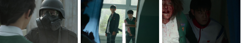 음악실. 애들의 처음 계획과는 달리 TV 조종도 안되는 상황. 음악실 안으로 이미 들어온 좀비들때문에.. 책상과 의자만으로 만들어진 바리게이트는 무너지기 일보직전이구요.. 대수와 수혁, 청산이 등으로 버티고 있고 여자애들과 준영은 밖에 있는 좀비들을 유인하기 위해 비명을 지르고 악기의 소리를 내고 있으며.. 우진은 복도의 동태를 살피고 있습니다. 바리게이트가 무너지려고 해서 마음이 급해진 아이들.. 순간 복도가 텅 비어있는 순간 우진은 뛰자고 소리치고..아이들이 복도로 와르르 몰려나갑니다. 끝까지 등으로 버티고 있던 대수를 청산이 이끌고 나와 다른 친구들과 함께 옥상으로 가기 위해 계단을 오르고 있어요. 미처 음악실로 가지 못한 학교 건물 안 곳곳의 좀비들이 뛰어가는 아이들의 뒤를 쫓고.. 수혁이가 계단을 올라가다가 스텝이 꼬여 넘어지니..그걸 본 남라가 되돌아 내려와 수혁한테 손을 내밀고 둘은 손을 잡은 채 계단을 올라가죠.