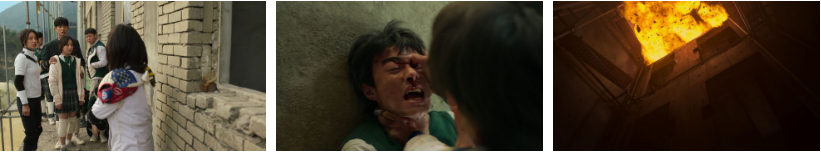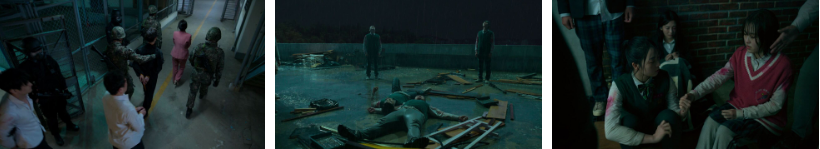 옥상. 철수는 군인들한테 혼자 구조가 되고..다른 생존자는 없냐는 질문에 끝까지 없다고 해버리죠. 철문을 사이에 두고 좀비들로 아우성인 옥상밖 다시 만난 청산과 귀남이 대치하고 있어요. 청산이 음악실에서부터 챙겨온 악보거치대로 사정없이 귀남한테 휘두르지만 끄덕도 않는 귀남은 눈X 내 놓으라며 청산의 한 쪽 눈을 찌르려는 순간 평소와는 뭔가 달라진 남라가 한 손으로 귀남의 목을 조르며 물어요.. "너 왜 안 죽었어??" 그리고는 고통스러워하는 귀남을 파란색 천막 천 아래 좀비들한테 던져버립니다. 놀란 다른 친구들과.. 자신의 오른 팔을 내려다보는 남라.. ㅎ 은지로 인해 불타는 교무실 천장 스프링클러가 작동되면서 건물 안 모든 잠금장치가 자동해제, 옥상문도 찰칵하면서 열리고..귀남이 잠깐 맥을 못 추는 사이 친구들이 옥상으로 들어와 문을 잠궈버리고.. 철수를 태워 막 이륙하고 있는 헬기를 미친듯이 손을 흔들면서 불러보는데.. 철수 혼자 곁눈질로 옥상의 친구들을 바라보고 있지만.. 헬기가 방향을 틀자 싸늘한 표정으로 시선을 거둬버리죠.