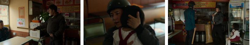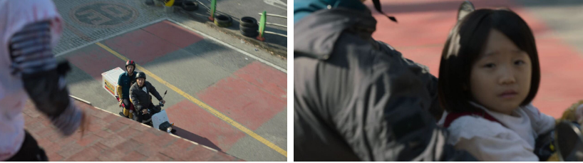 청산네 치킨가게. 여기에는 형사인 재익과 후배..그리고 희선 학생이 막 낳은 신생아.. 그리고 4살정도 되는 여자아이가 있습니다. 팔뚝과 배, 그리고 허벅지 종아리를 두꺼운 종이로 덧대고 노란색 강력 테이프로 칭칭 감은 재익과 후배가 여자아이도 칭칭 감아주고 있죠. ㅎ 계속 징징대는 후배를 향해 4살 여자아이 하는 말이.. ㅎ "무서우면 아저씨는 그냥 여기 있어요~" ㅋㅎ 밖에 있는 스쿠터를 타고 갈 것이라고 설명하는 재익한테 여자아이가 자기 엄마는 어떻게 하냐고 물어보는데.. 지금은 우리끼리 가고 나중에 엄마 데리러 오자고 재익은 말하죠. 맨 앞에 재익 그리고 여자아이와.. 갓난아이를 앞으로 메고 있는 후배순으로 앉아 있는 스쿠터가 소리를 내면서 출발하니 사방에서 좀비들이 뛰어오기 시작하고 ..놀란 후배가 소리를 지르니 그 소리에 더 요란하게 좀비들이 따라 붙습니다 ㅎ